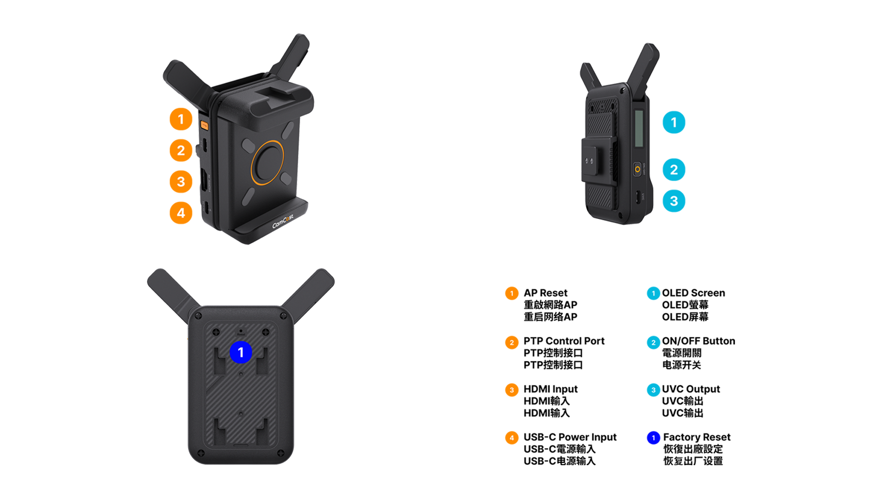 1. 使用 NP-F 電池 或 5V/3A 電源供應,使用 HDMI 傳輸線 將 CamCast 與攝影機連接。長按 「ON/OFF」 按鈕 5 秒以開啟 CamCast 電源。