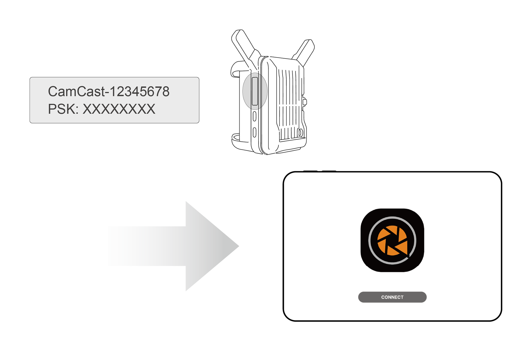 2. Check the OLED screen for SSID and password. Download CamCast app on Android/iOS. Connect your devices following the instructions and press “Start Casting” in the app.